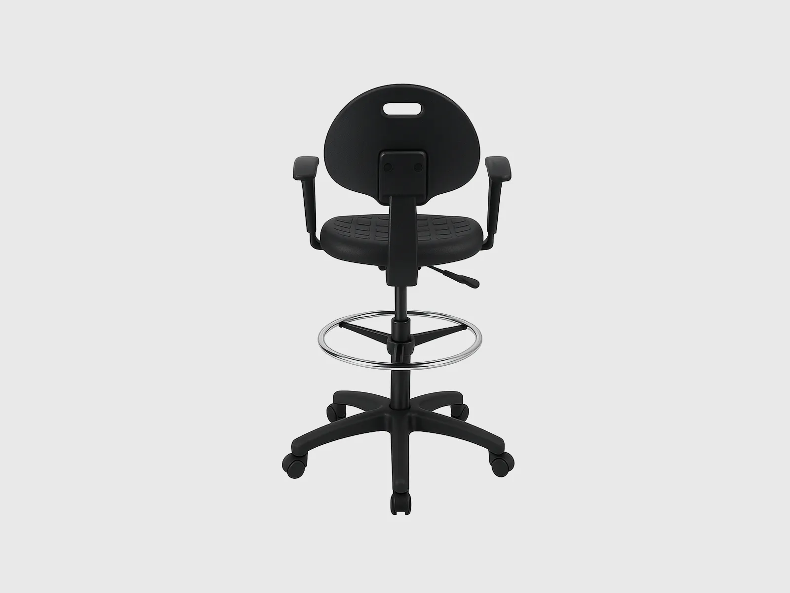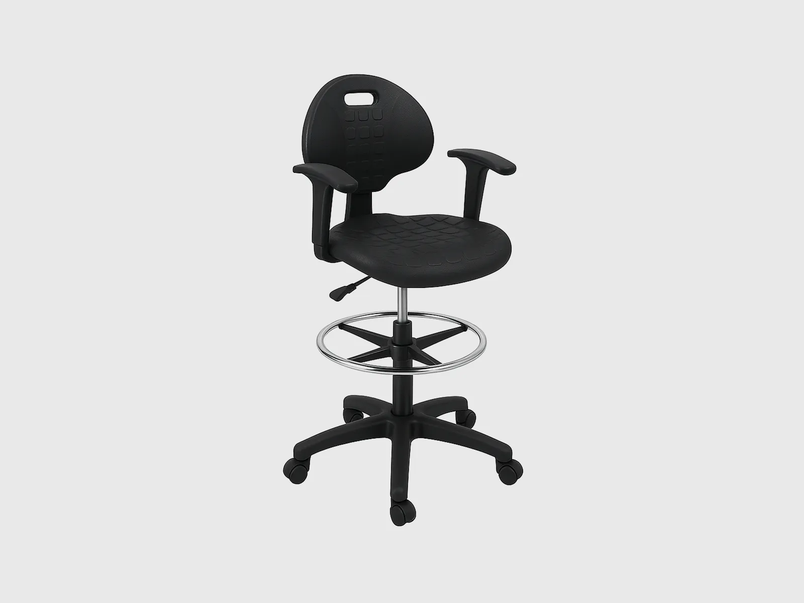 Built on a sturdy nylon base, the stool integrates a footring for added comfort and functionality. Its height-adjustable mechanism and swivel function make it adaptable to multiple work scenarios, from laboratory settings and drafting studios to collaborative office environments.