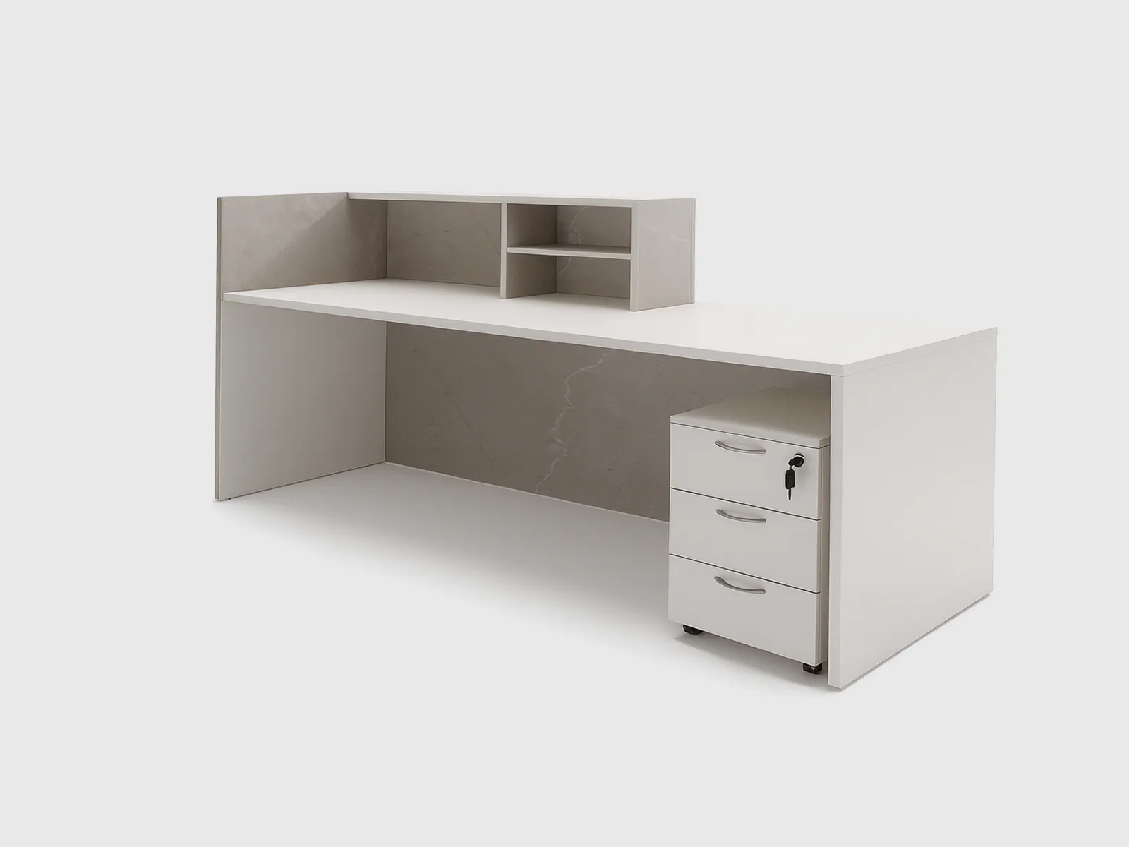Available in three different lengths—1800 mm, 2400 mm, and 2800 mm—the RC-02 adapts seamlessly to a variety of reception areas, whether compact or expansive. Its 25 mm thick tabletop provides a solid, long-lasting surface for daily use, while optional storage with a 3D mobile pedestal ensures added convenience and organization.