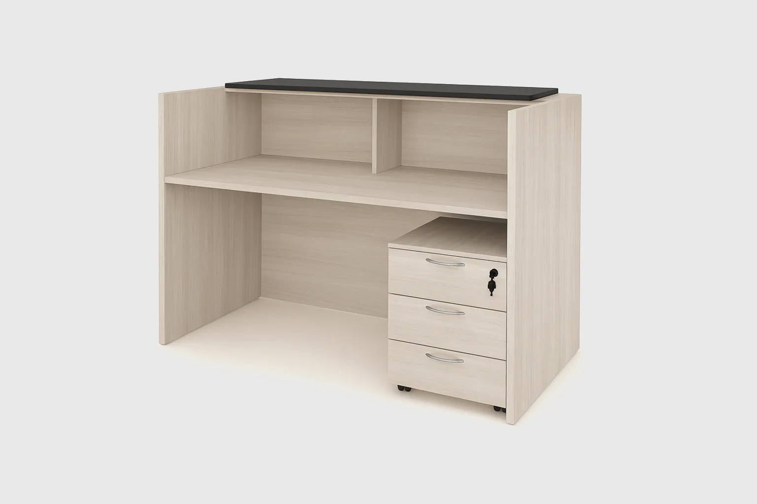 The 25 mm thick tabletop ensures a strong and reliable work surface, capable of supporting daily reception tasks. Optional integration of a 3D mobile pedestal allows for added storage of files and essentials, helping to keep the workspace organized and efficient.