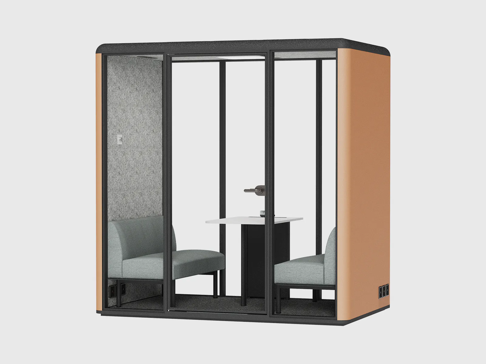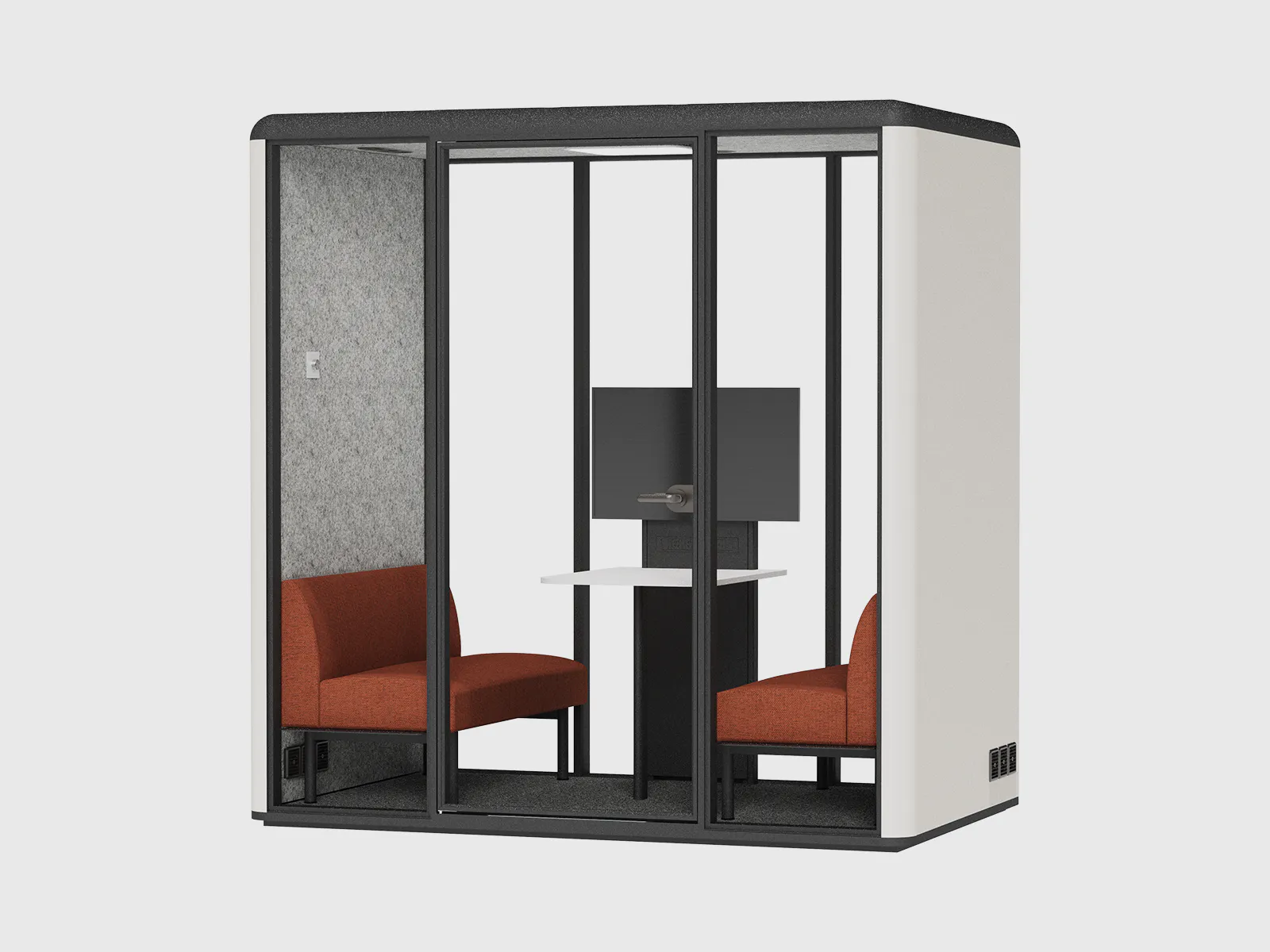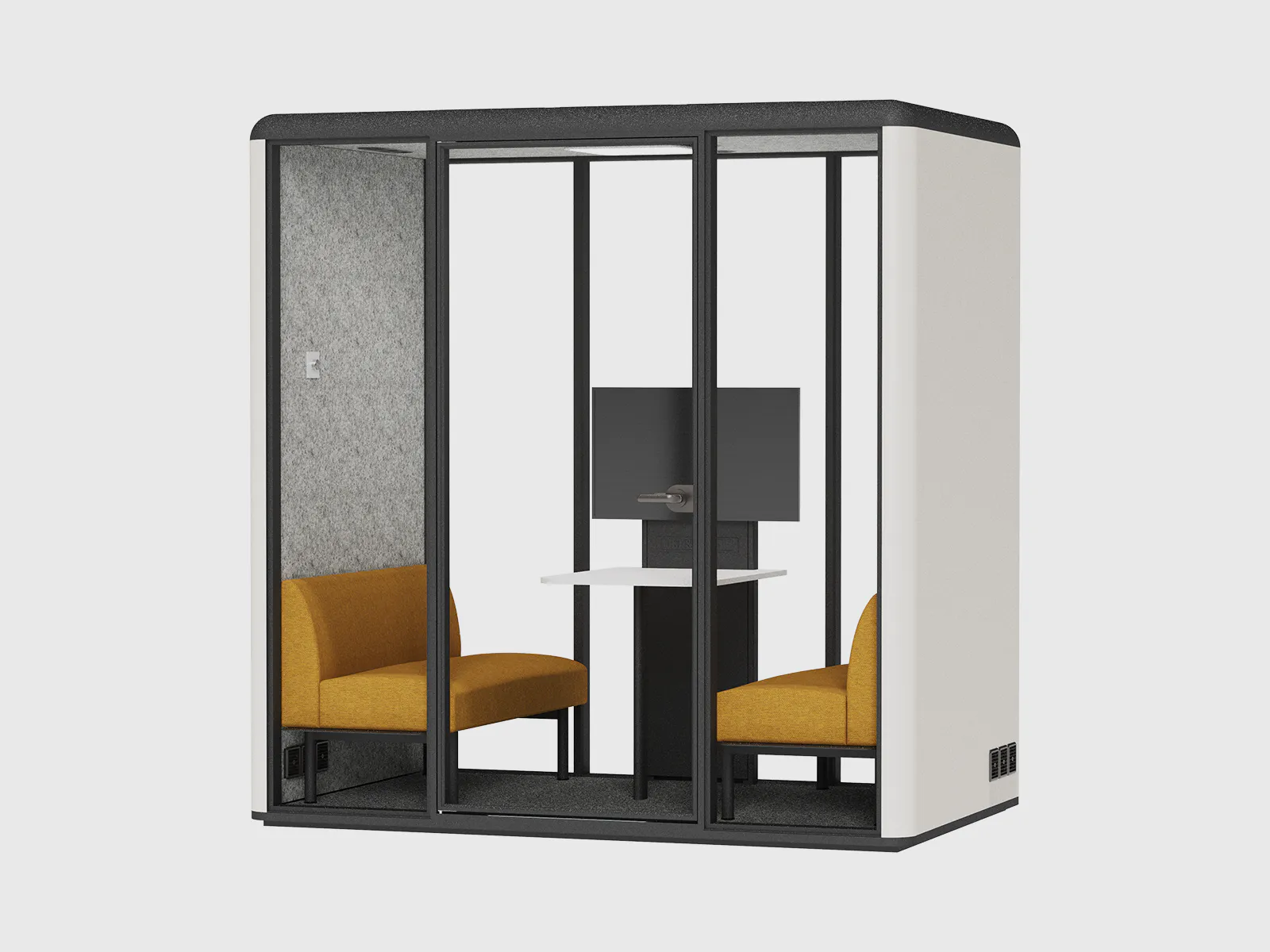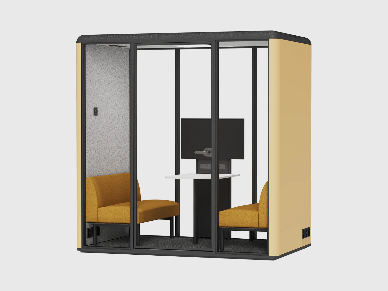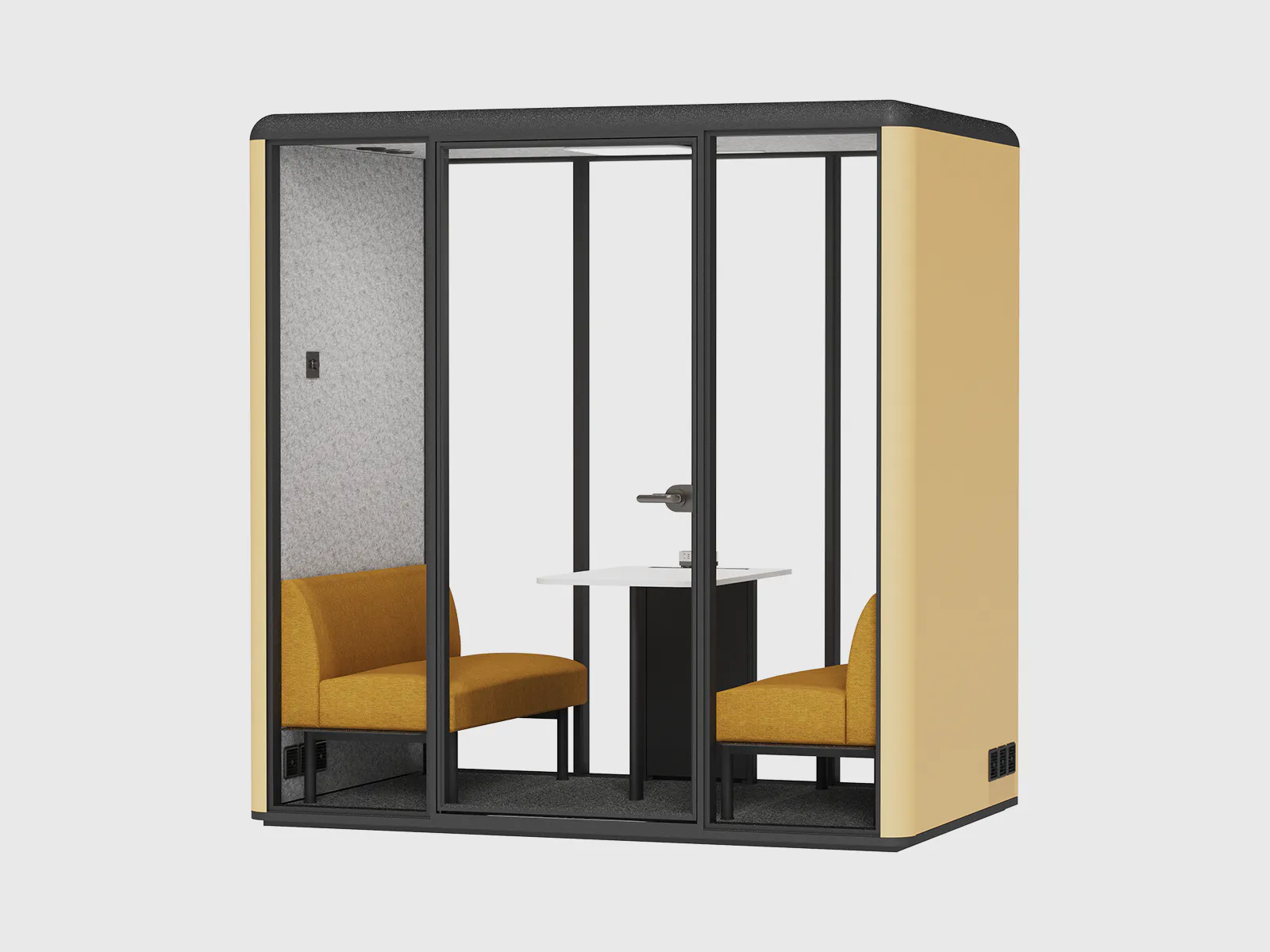 Inside, the pod features an integrated negotiating table and a built-in sofa, providing both functionality and comfort. With finish options in white MFC, natural wooden tones, or bold yellow powder-coating, the booth can be tailored to match your office aesthetics and brand identity.