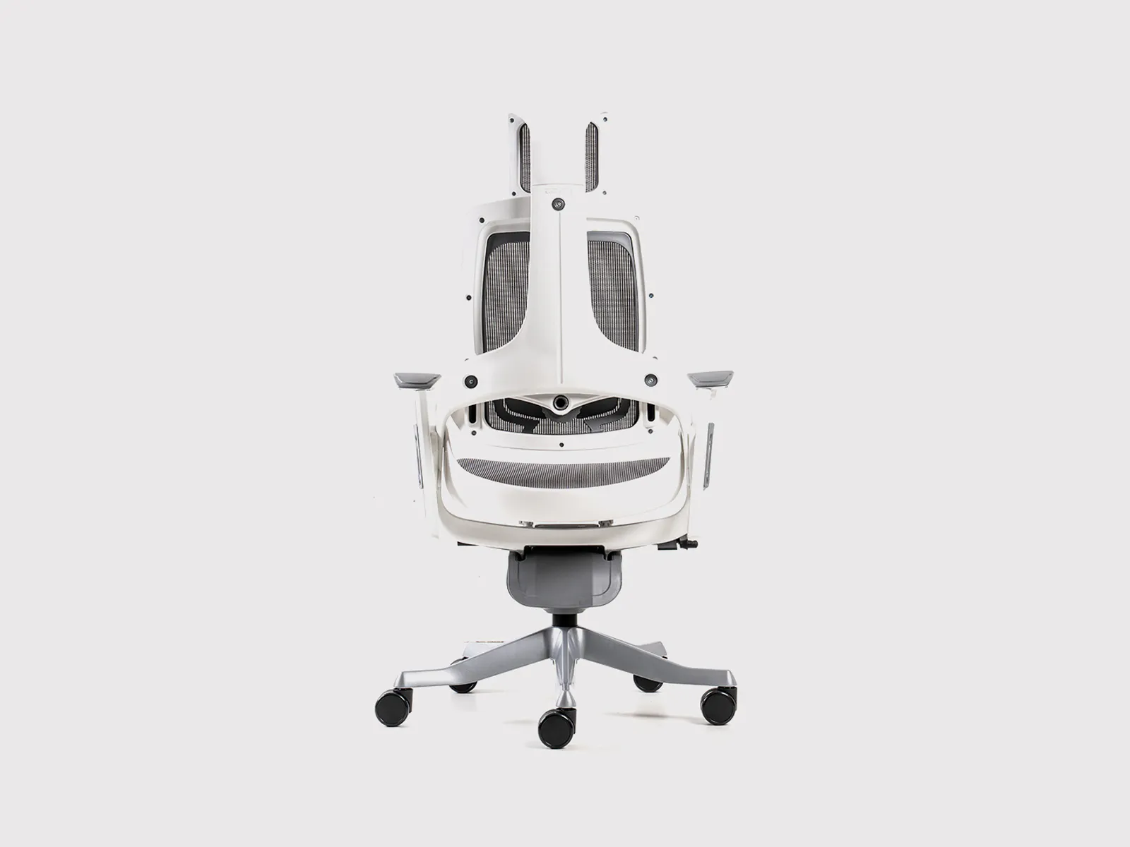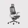 The headrest, seat, and backrest all use high-quality, 100% recyclable molded polypropylene in stylish combinations of white or black outer shells with grey inner detailing. Upholstery options include premium fabric or leather, backed with eco-friendly polyurethane foam padding. The mesh backrest, made of durable elastomer, is reinforced with recyclable SEBS thermoplastic overlays for added comfort and support.