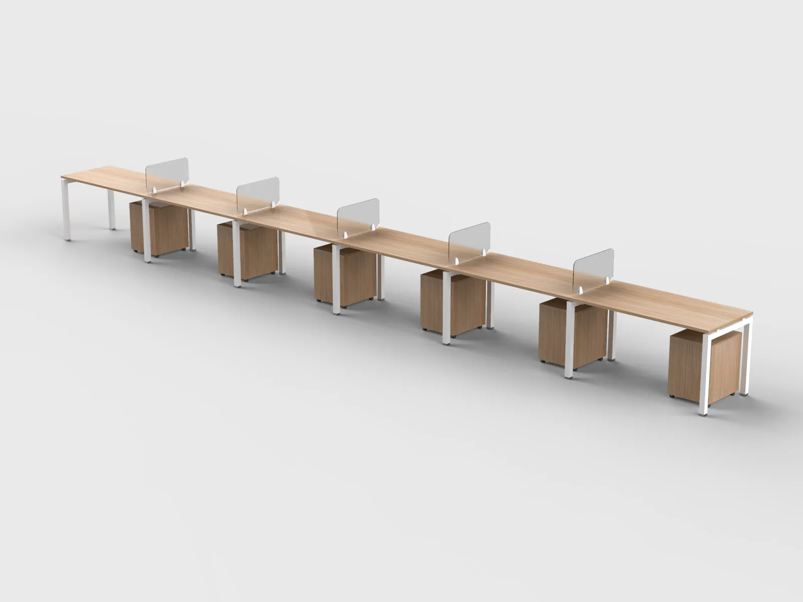 The Single Line Cluster of 6 Workstations – Parma Collection is purpose-built for open-plan work environments where collaboration, organization, and space-efficiency are key. With a sleek linear configuration, this workstation cluster comfortably supports six users in one continuous layout, making it ideal for team-based departments, call centers, or co-working hubs.Each workstation features a high-quality melamine tabletop available in a range of finishes including White, Grey, Oak, and Walnut—paired with the signature Parma-style powder-coated metal legs that provide long-lasting strength and modern appeal. Choose between 18mm or 25mm tabletop thickness to achieve the perfect balance of durability and visual presence for your space.Whether you prefer mobile storage, hanging pedestals, or a minimal setup without storage, this cluster is configurable to fit your team’s unique workflow. Partition options in acrylic or fabric offer the right amount of separation, enhancing focus while maintaining an open, collaborative feel.Elevate your workspace further with optional accessories like flip covers for easy connectivity, PDUs for integrated power access, cable snakes, and under-desk trays for tidy cable management—ensuring a clean and efficient environment from every angle.